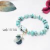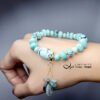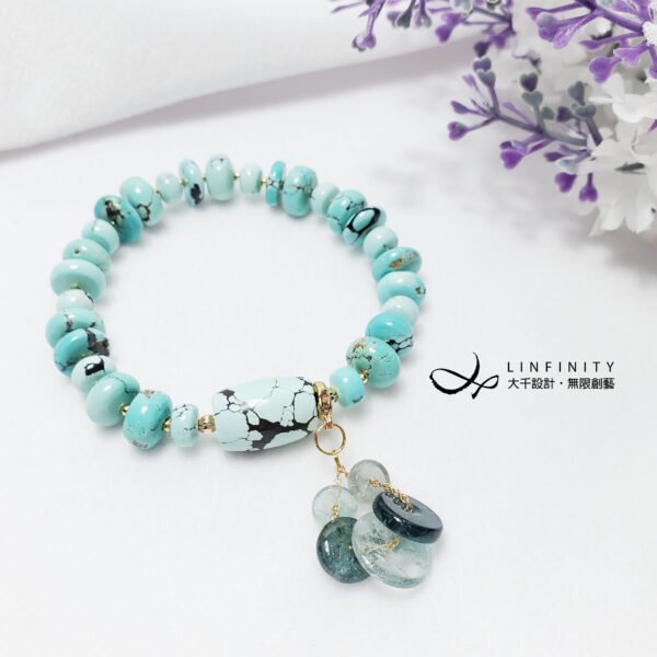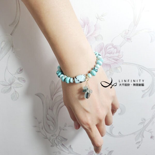 1.圖上松石主珠長約15.8mm、寬約11.3mm,鍊身松石扁珠直徑約7-10mm,藍碧璽古錢直徑約6.9-12.8mm,整體手圍約16cm。