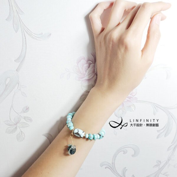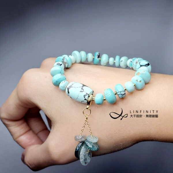藍松石瓷化表現佳、鐵線優美,福氣典雅,藍碧璽由天藍到靛藍,皆晶體清澈、火彩閃耀,整體舒心而高貴的藍色調特顯雍容華貴,演繹出亙久的寶石能量與美麗紋理。