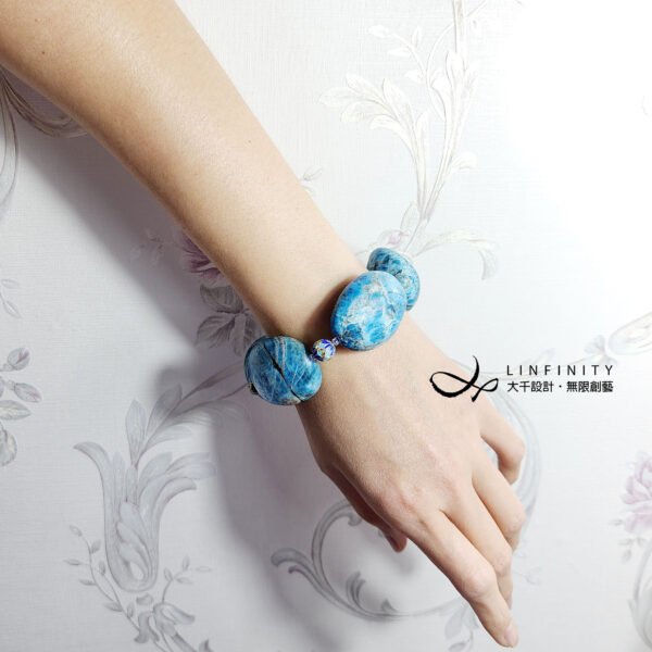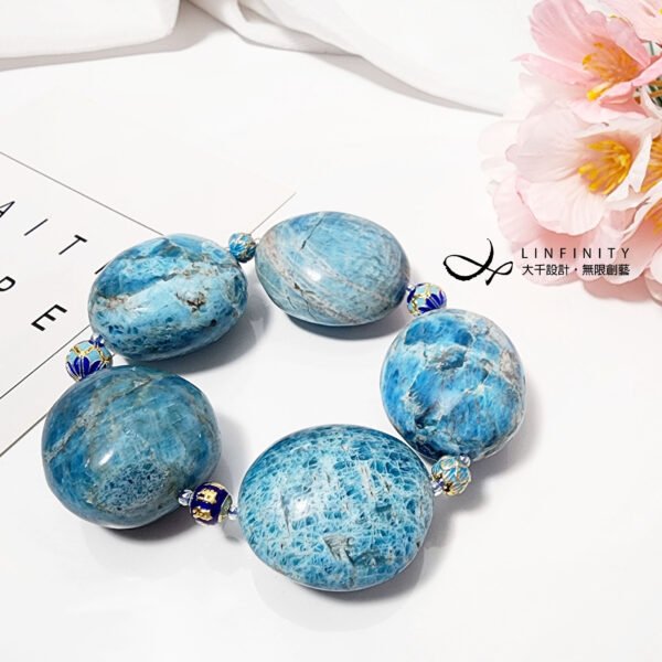 呼應藍磷灰石的多層次藍色調,鍊身飾以藍色調琺瑯多寶(六字真言-智慧、蓮花-清淨、球-圓滿),使整體的藍活潑趣味,上手若巨型花朵在手腕綻放,大方美麗,亦是喜愛藍磷灰石(甚或藍色調寶石)的藏友們值得收藏、把玩的巨作^^
