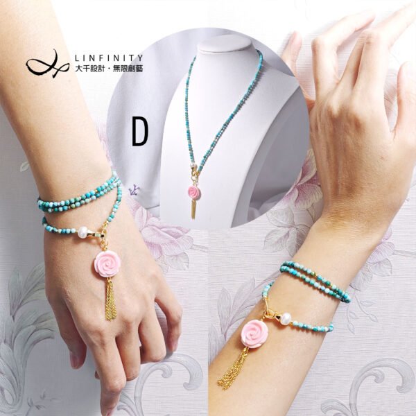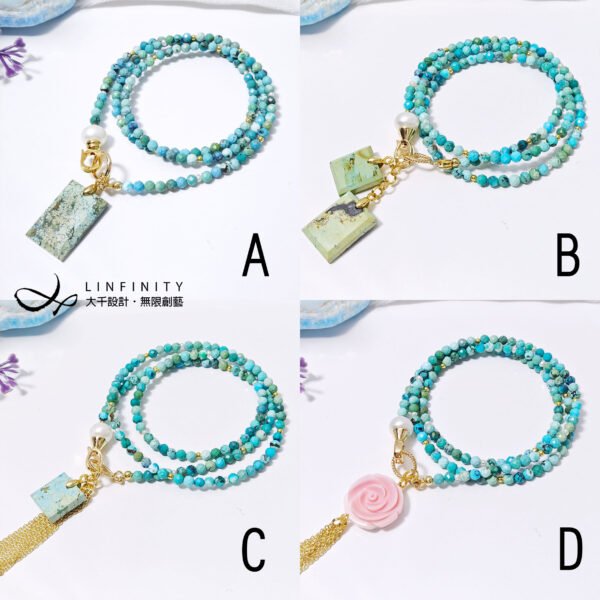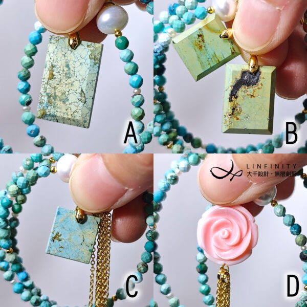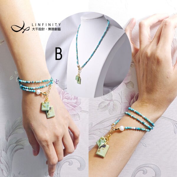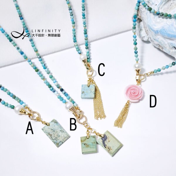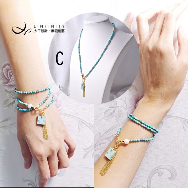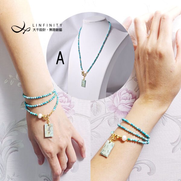 松石瓷度表現極佳(高瓷),精工磨製鑽面珠飾,更顯細膩閃亮,搭配珍珠設計為3圈手鍊、短項鍊2用首飾,設計4款主墜: