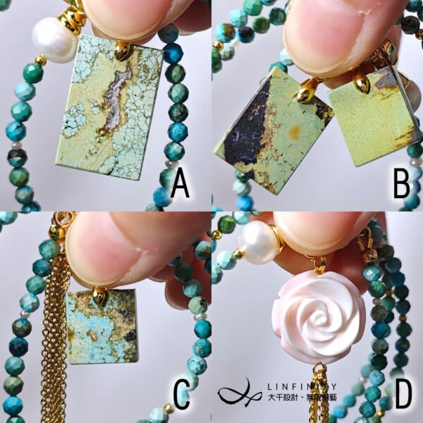 D款-女皇貝+金流蘇:女皇貝的粉色十分相襯松石的藍綠色,2種寶石同樣高瓷度,柔美古典中不減富貴之氣息。