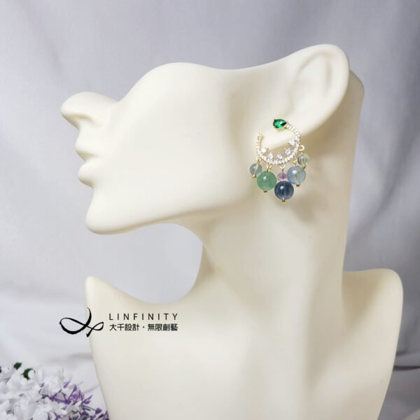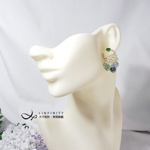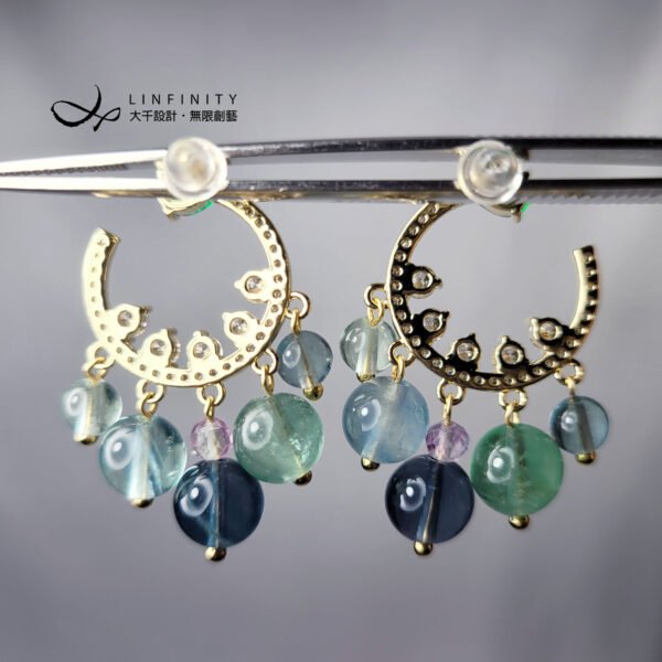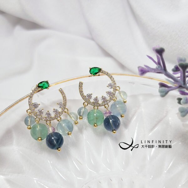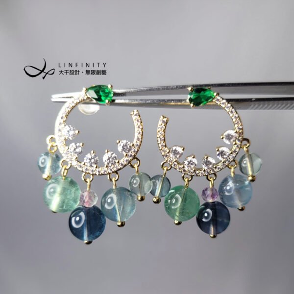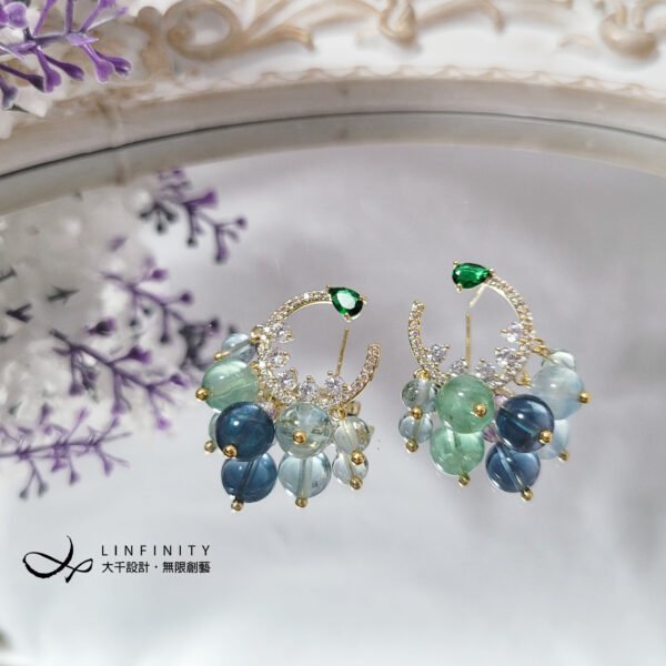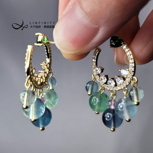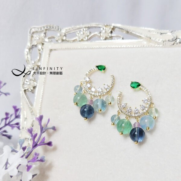 嚴選頂級淨透藍綠雙色螢石,寶石火彩艷麗、閃現星光、絲綢光,頂上相佐翠綠色萊茵石耳針,富貴華美,別緻動人。