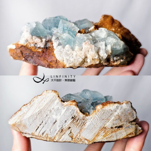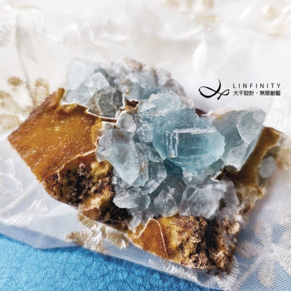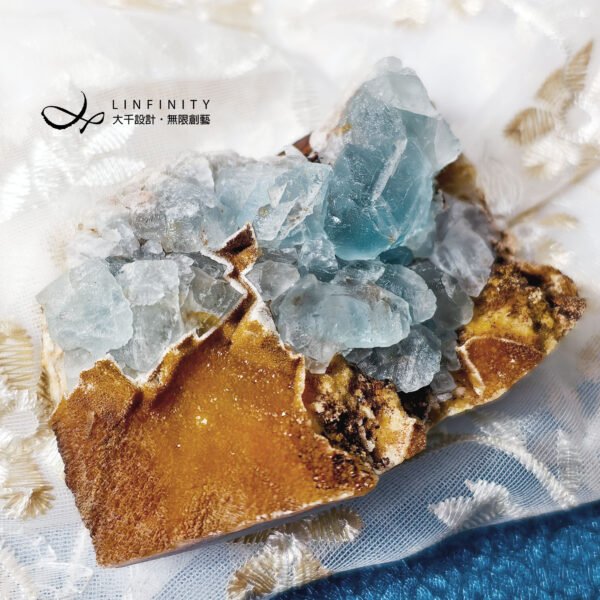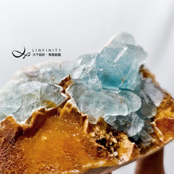 設計師高規嚴選本件螢石家族中最稀有之藍螢石共生黃水晶擺件。