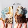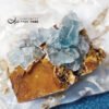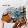 晶鎮正面,藍螢石生長於細膩黃水晶簇上,有如泉水自金礦脈中湧出,色彩對比亮眼,每一角度皆展現自然生成的層次感與神秘美感,令人心馳神往,呈現富貴招財之意象。