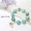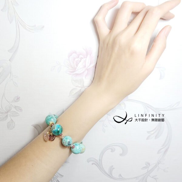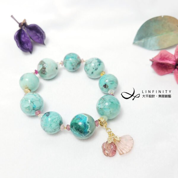 在滿佈藍松、綠松的藍銅礦上,可見玉化紋理,更有些許紅、黃色赤鐵礦天然點綴其間,故巧思以橘、粉色古董寶石-碧璽為主墜,並安排於鍊身,使整件寶石作品色彩輕盈時尚,細節耐人尋味。
