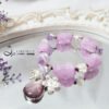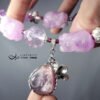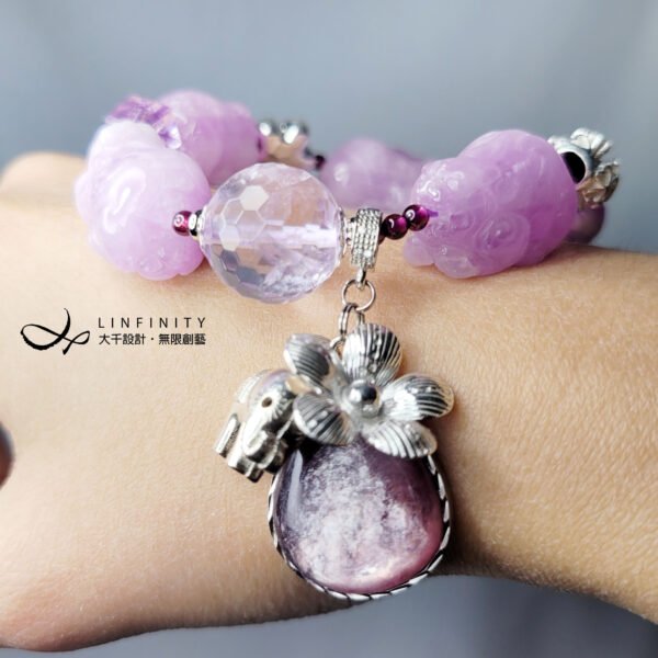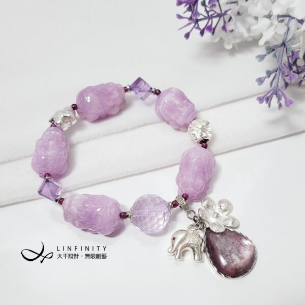 鍊身飾以薰衣草紫水晶(開智慧)、頂級紅石榴石(紫牙烏)、銀花(富貴)、銀四葉草(幸運)球飾,寶石淨體水光美,整體韻律美麗,富貴大器,充滿吉祥寓意。