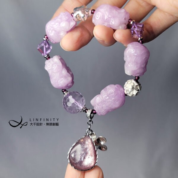 1.圖上紫鋰輝獬豸長約22.6-25mm,紫鋰雲母水滴高25.5mm,整體手圍約16cm。