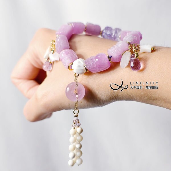 精選黃金硨磲佐紫鋰輝古錢編製流蘇墜,更臻典雅氣息。