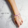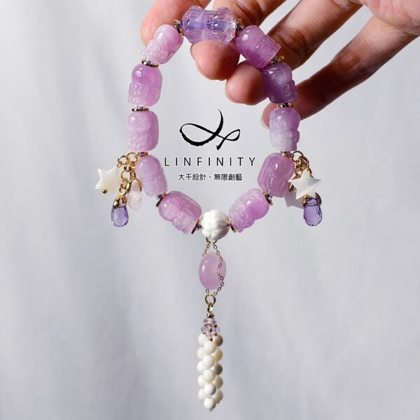 1.圖上鍊身紫鋰輝貔貅長約13mm,紫水晶並蒂蓮長約17mm,主墜流蘇(紫鋰輝古錢+黃金硨磲)總高55mm,整體手圍約16cm。