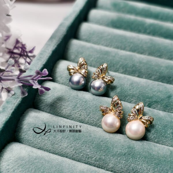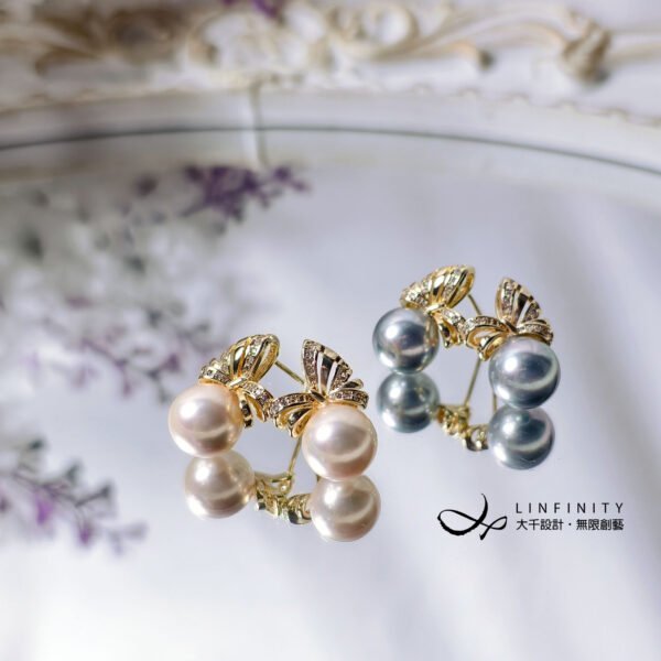 粉、銀貝珠珠圓玉潤,閃現迷人絲綢光澤,優雅細膩,婉約可人。