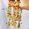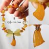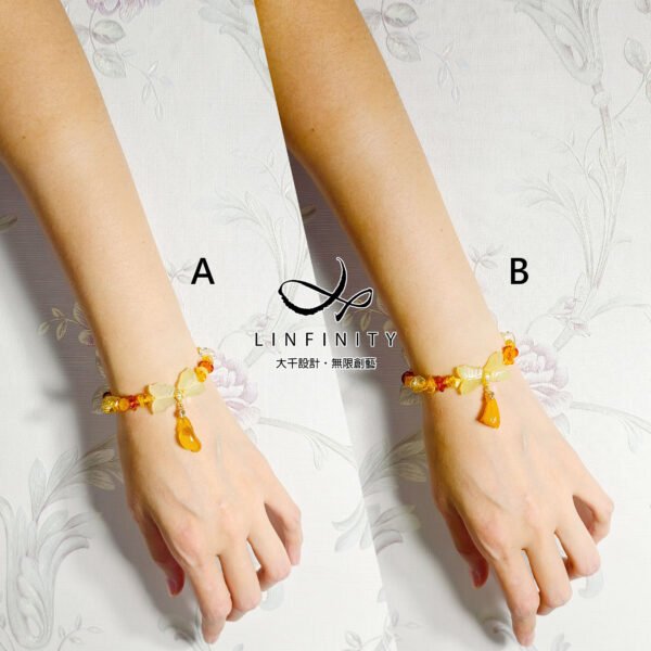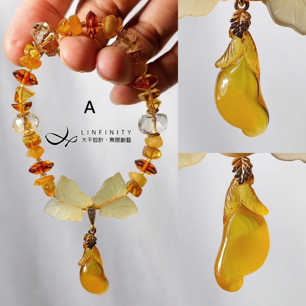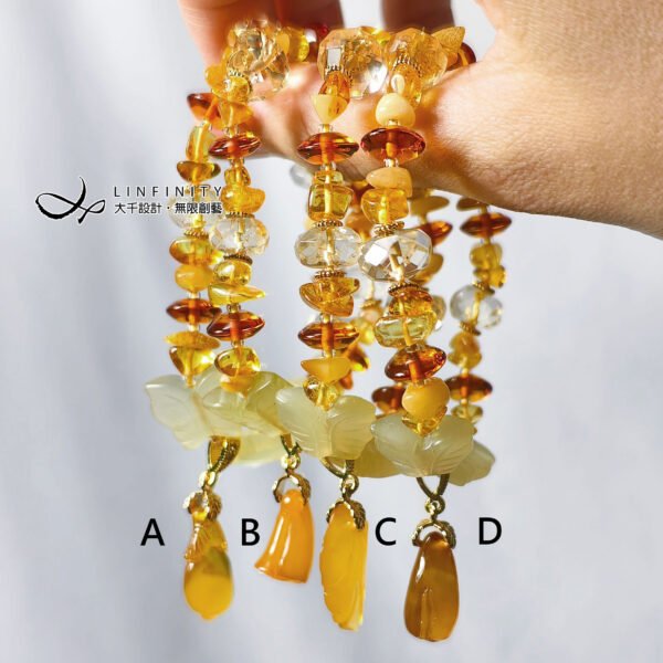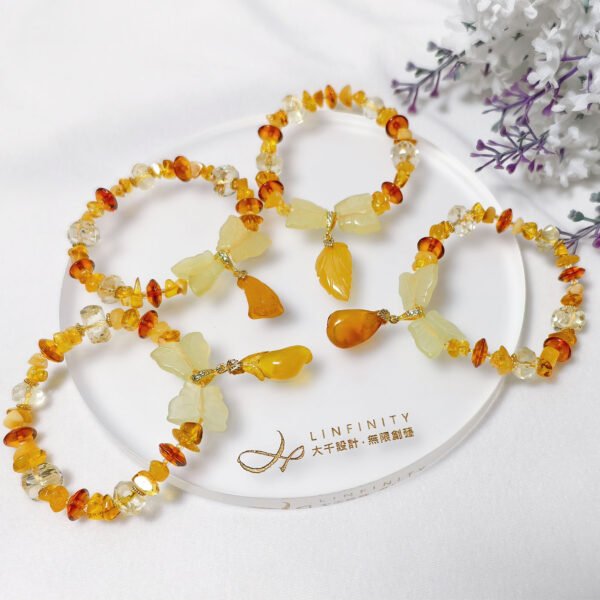以頂級琥珀(蜜蠟)隨型珠、算盤珠設計鍊身,寶石晶透、水潤、放光。