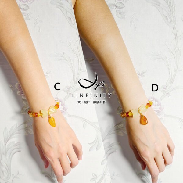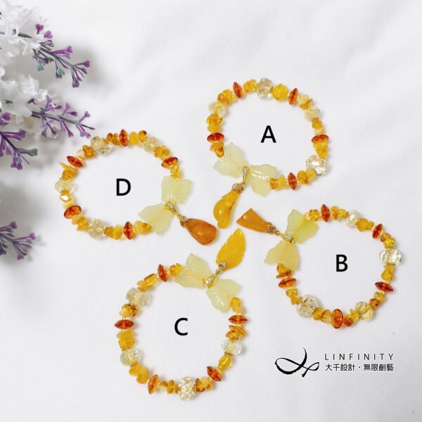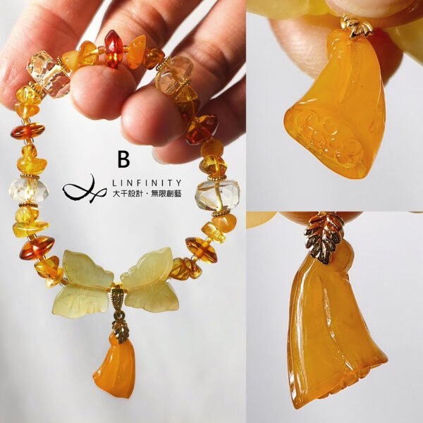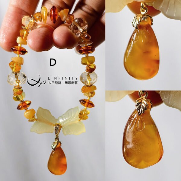 1.圖上琥珀算盤珠寬約9.2mm,黃水晶鑽面珠寬約11.5mm,黃岫玉蝴蝶寬約16.5mm,A款茄子高約23mm,B款蓮蓬高約18mm,C款葉高約22.5mm,D款福鼠高約18.6mm,整體手圍約15.5cm。