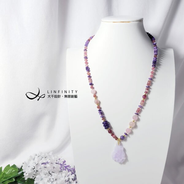 如題,嚴選頂級紫龍晶,相佐美艷粉碧璽編製鍊身,主飾翡翠(紫羅蘭)白菜(百財)墜。