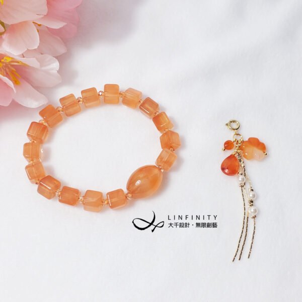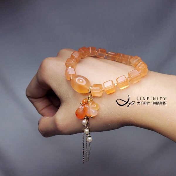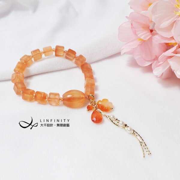 1.圖上瑪瑙主珠長約16.5mm、寬約13.3mm,兔毛水晶魔方約7.6mm,隨意扣(釦頭+花+流蘇)高約66mm,整體手圍約16cm。