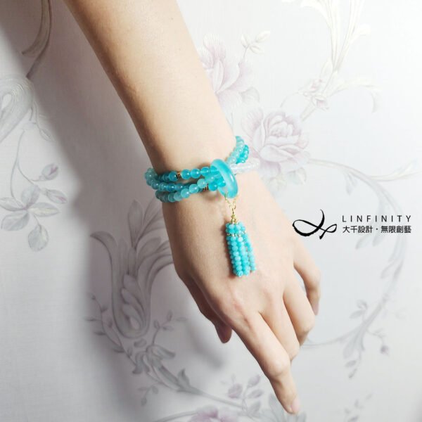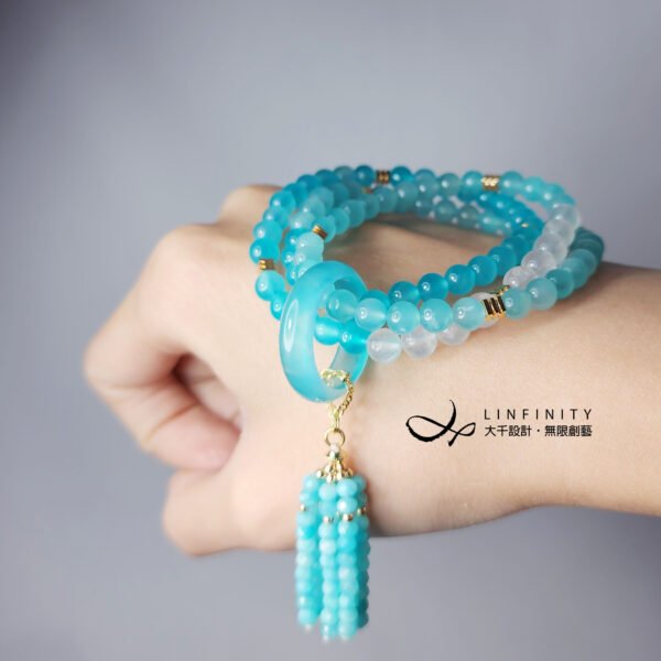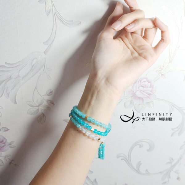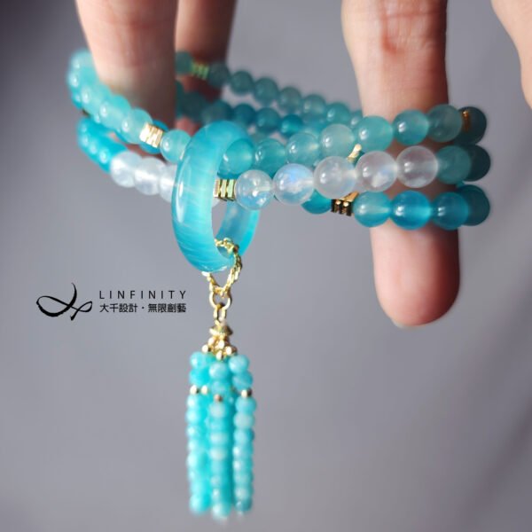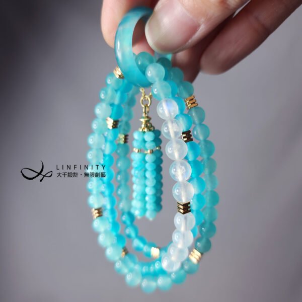 天河石為冰綠等級,冰潤優雅,雕製圓潤珠飾、扳指(寓意一元復始、萬象更新),佐藍月光石設計3圈華美形制,寶石水光勻淨、色彩漸層律動,水紋清晰優雅、無黑點、品相全美,優雅環繞手腕,風韻細緻,上手冰涼滑順、能量溫和而舒適。