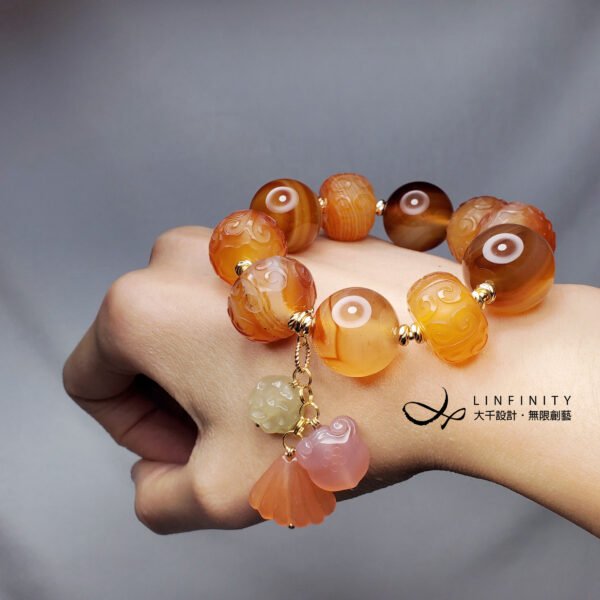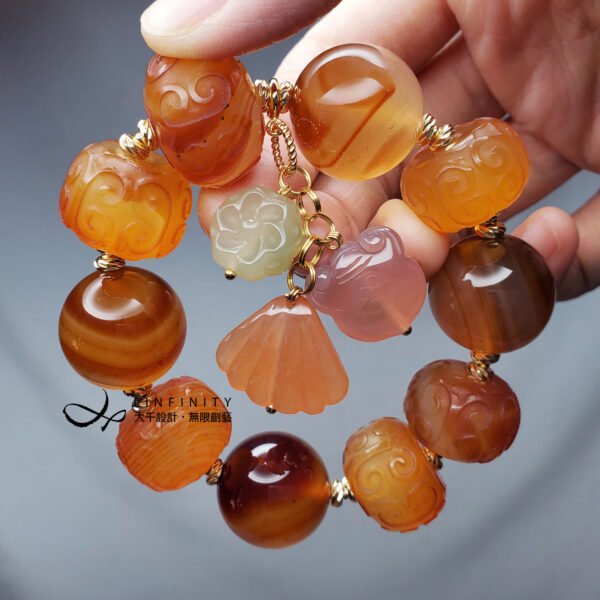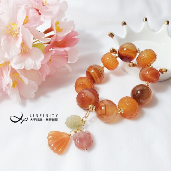 嚴選冰種纏絲瑪瑙,精工雕製回紋珠飾、大器圓珠、各式吉祥多寶(花、如意、貝),寶石顆顆色彩冰潤、纏絲紋理優美,寶石體材相當大,盡顯富貴、華美、與大器。