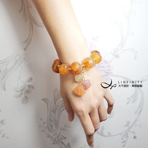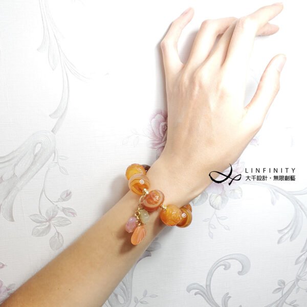 1.圖上瑪瑙珠直徑約19-21.6mm、厚約14-20mm,隨意扣(花+如意+貝)高約50mm,整體手圍約16cm。
