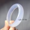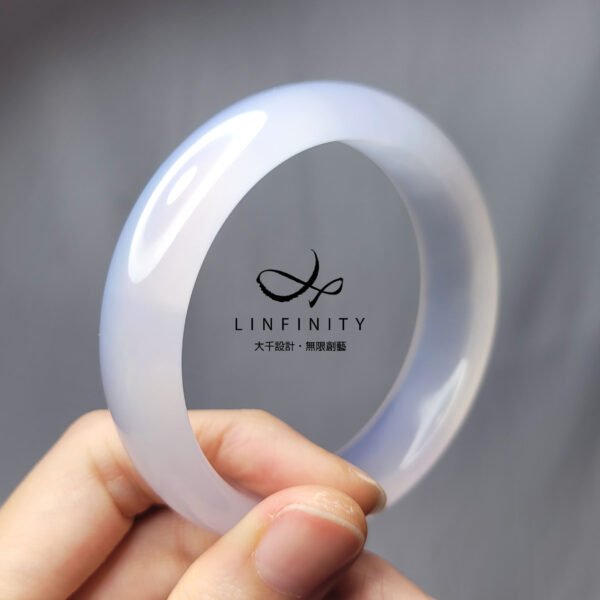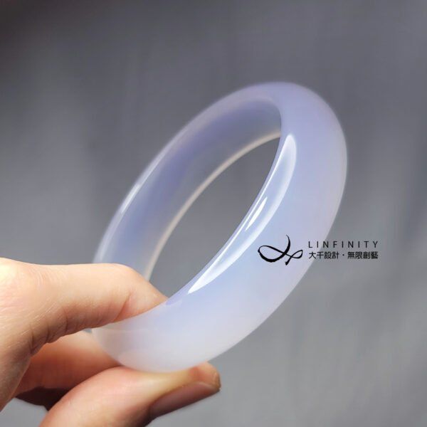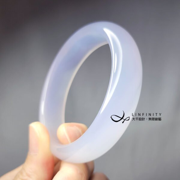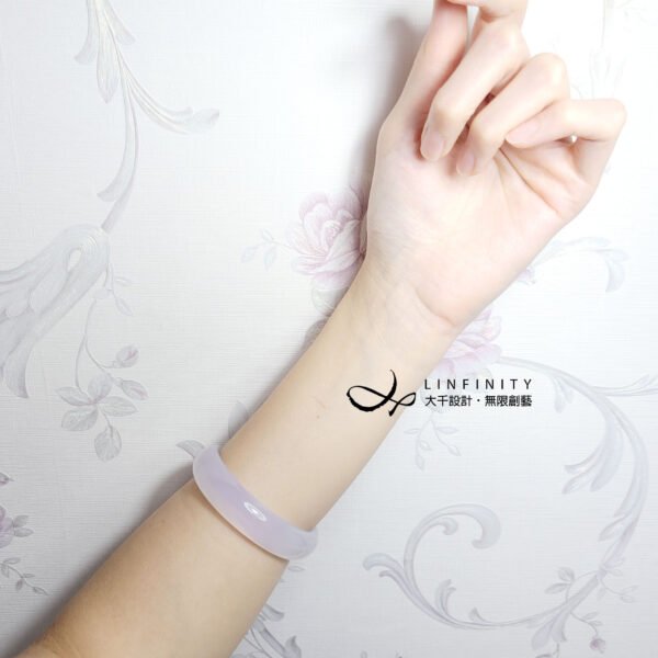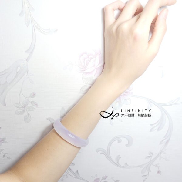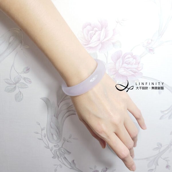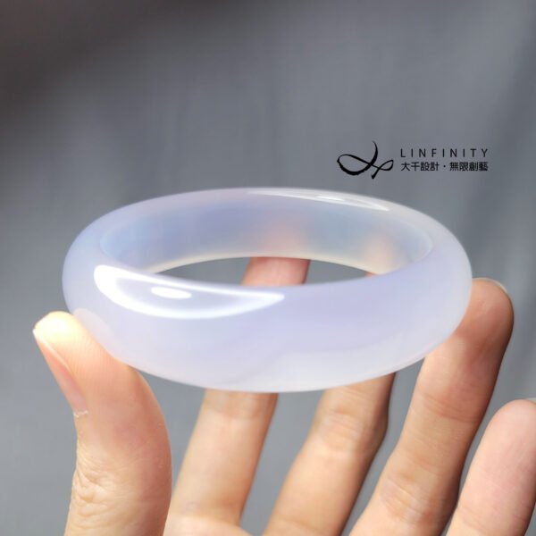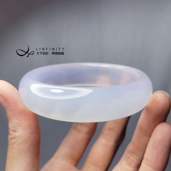 嚴選冰種白玉瓍(瑪瑙),水光帶紫、起瑩泛光、細膩溫潤,無瑕、無裂、無礦缺、無斑點,帶絲縷天然絲狀紋理,不同光線角度下呈現自然白、紫色漸變光澤,極其優美,版寬而厚,大器華美非凡。