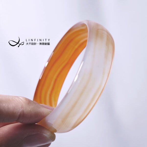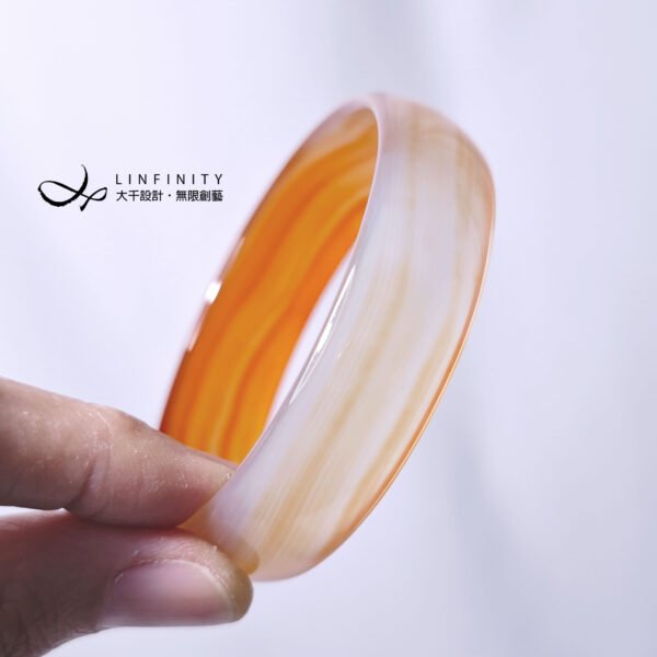 嚴選頂級冰種纏絲瑪瑙(玉瓍),清透水潤、晶瑩泛光、色彩勻淨、細膩溫潤,無裂、無斑點、無礦缺,不同光線角度下呈現自然橙、紅漸變光澤,纏絲紋理清晰細膩、獨一無二,扁鐲型,秀雅美麗。