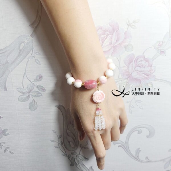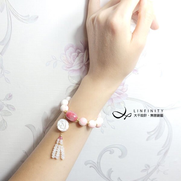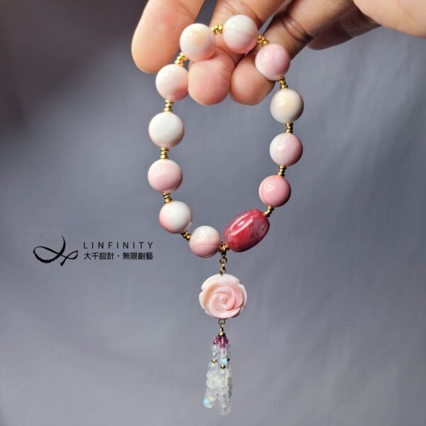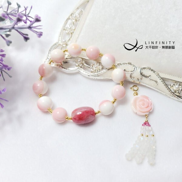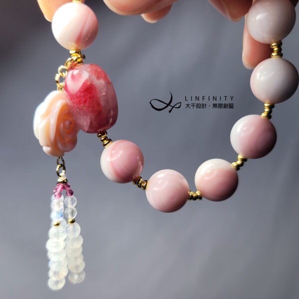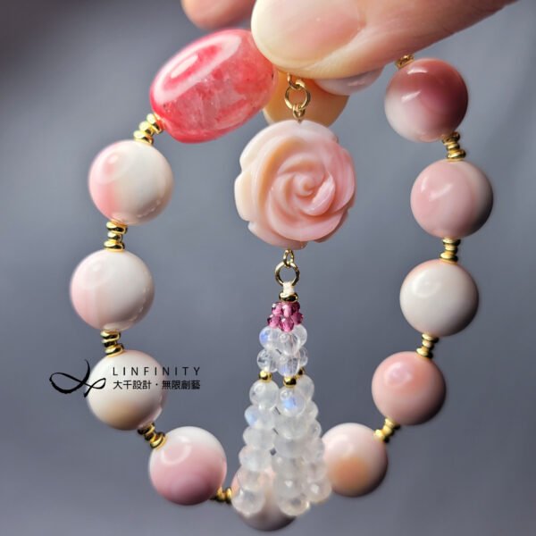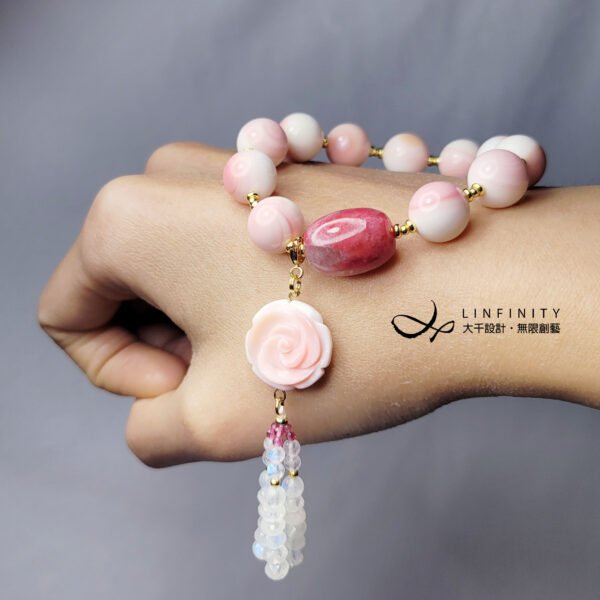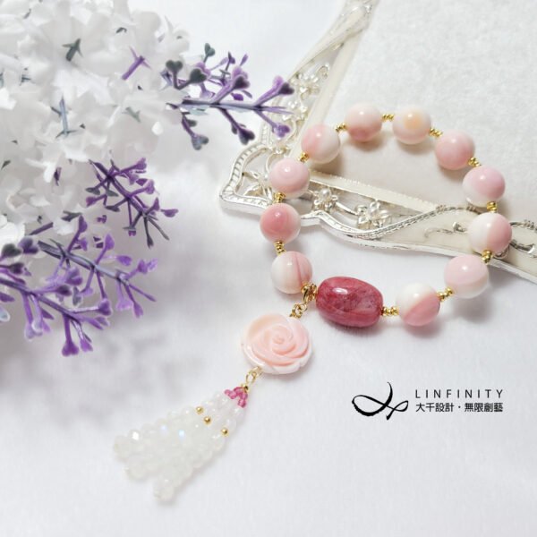 嚴選靈性的有機寶石女皇貝(粉硨磲),精雕玫瑰花(富貴)飾、圓珠飾,相佐玉化玫瑰石、靈性藍月光石,演繹浪漫華美、富貴細膩的風韻。