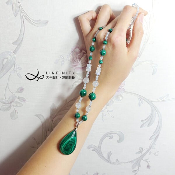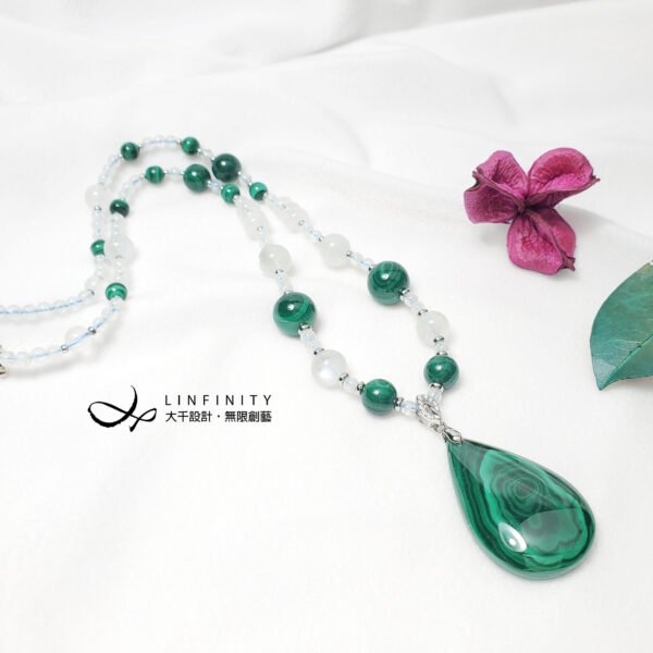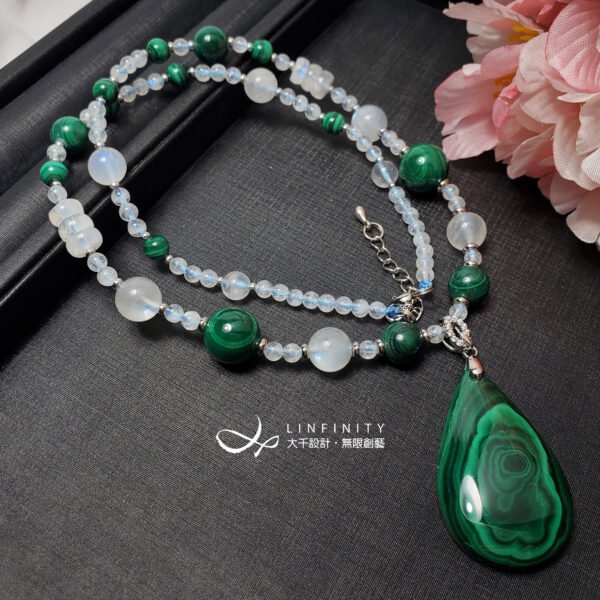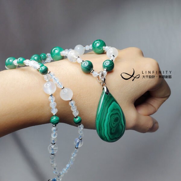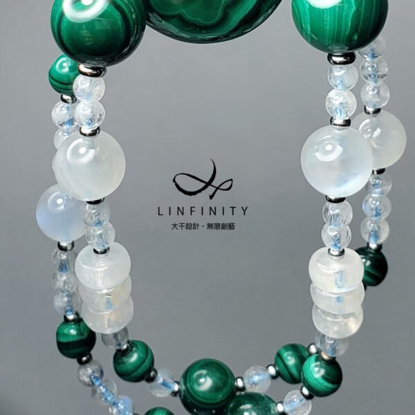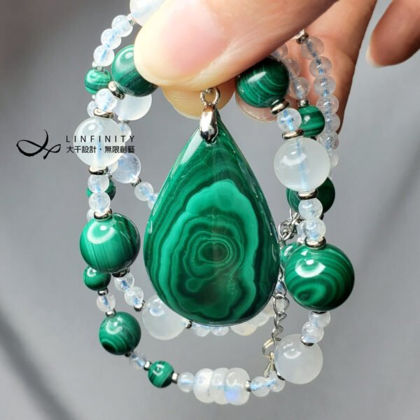 嚴選色帶紋理獨具之頂級孔雀石,相佐藍暈月光石,寶石色正而艷、水光勻淨,體現女性大器智慧、富貴柔美之風情。