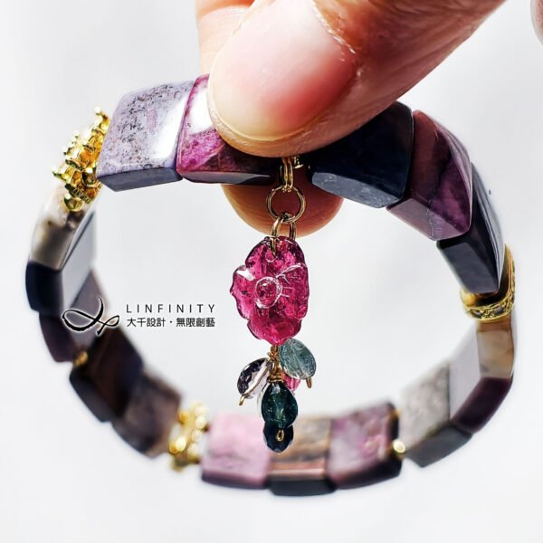鍊身襯以K金配飾,主墜點綴紅碧璽花,藍、紫碧璽水滴,寶石火彩強、水光勻淨、色彩清亮,品相頂級。