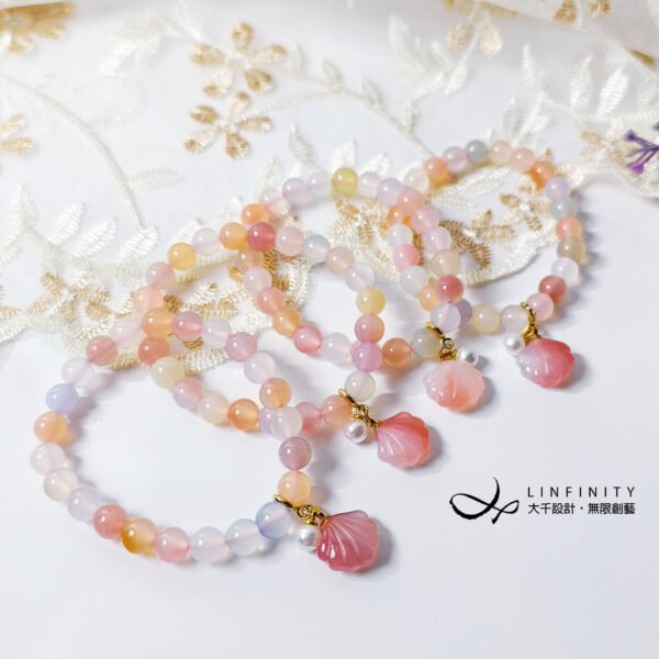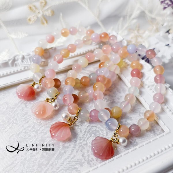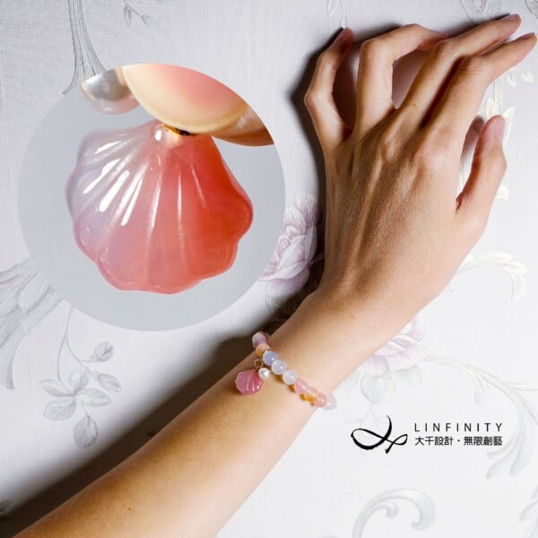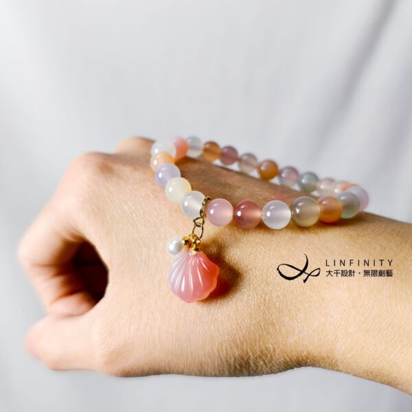 佐鹽源瑪瑙貝(招財)、珍珠設計隨意扣,點綴優雅細節,使整體更加靈動精緻。