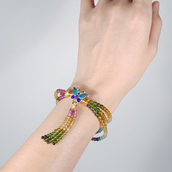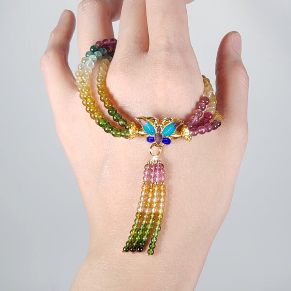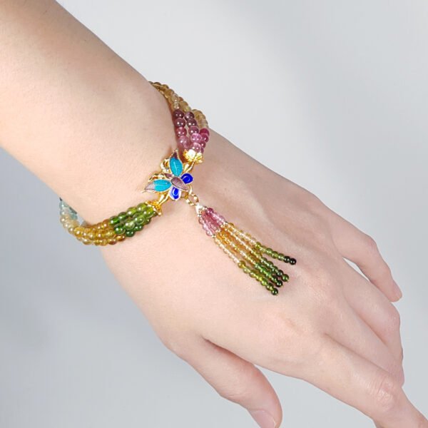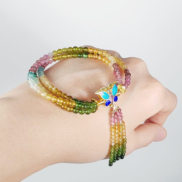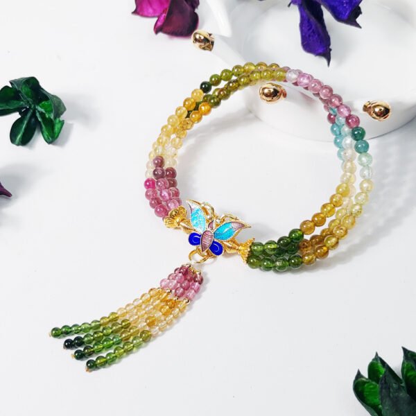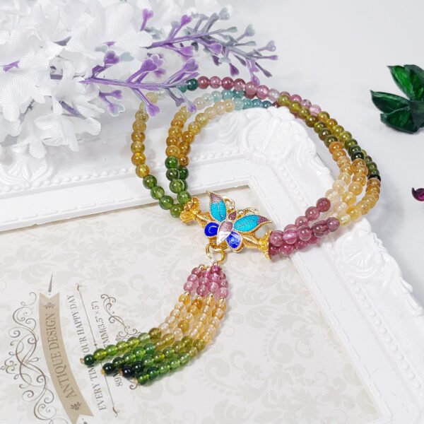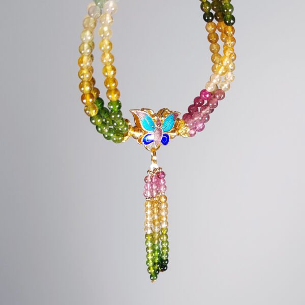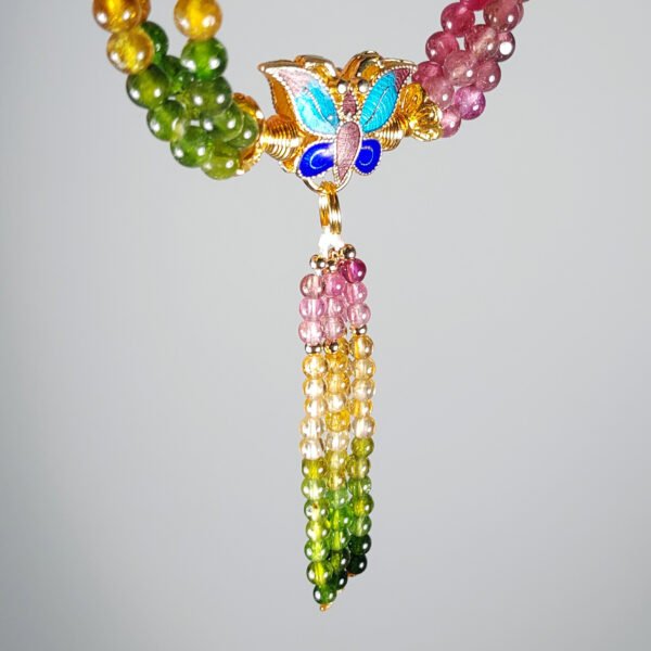 嚴選頂級彩虹糖果碧璽,精工編製,相佐景泰藍(掐絲琺瑯)蝴蝶,時尚亮麗、細緻優雅、福(蝴)氣綿延。