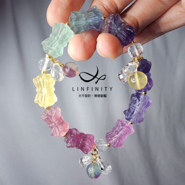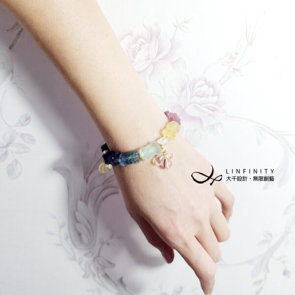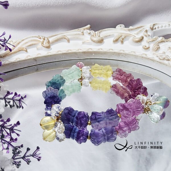 在天然寶石的領域,螢石屬於顏色最豐富的石頭,因為含有鐵、鎂、銅等離子,綠、紫、黃、藍、棕、橙、粉……螢石幾乎可以呈現任何顏色,宛如彩虹般美麗,故亦有「彩虹寶石」之美稱。