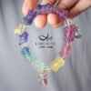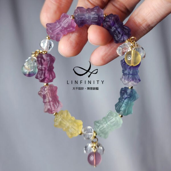 嚴選頂級彩虹螢石,精工雕製並蒂蓮珠型,鍊身3處(三元及第)飾以白水晶(水晶之王)鑽面水滴飾、螢石珠飾,寶石閃耀、晶體透、水光美、火彩強、無斑、無裂,品相極美。