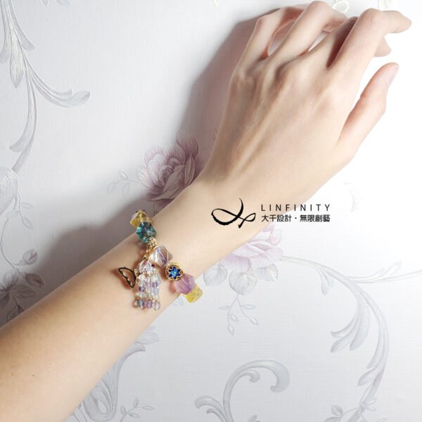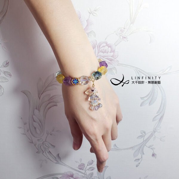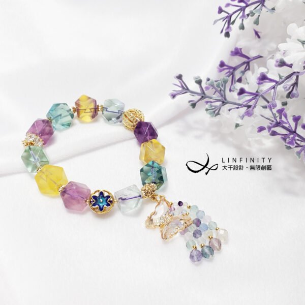 嚴選頂級色度、透度兼備之彩虹螢石,精工磨製閃耀切(鑽)面珠型,相佐富貴琺瑯、水晶福氣蝴蝶與流蘇飾,寶石水光極美、火彩繽紛、華美閃耀,氣質極其優美。