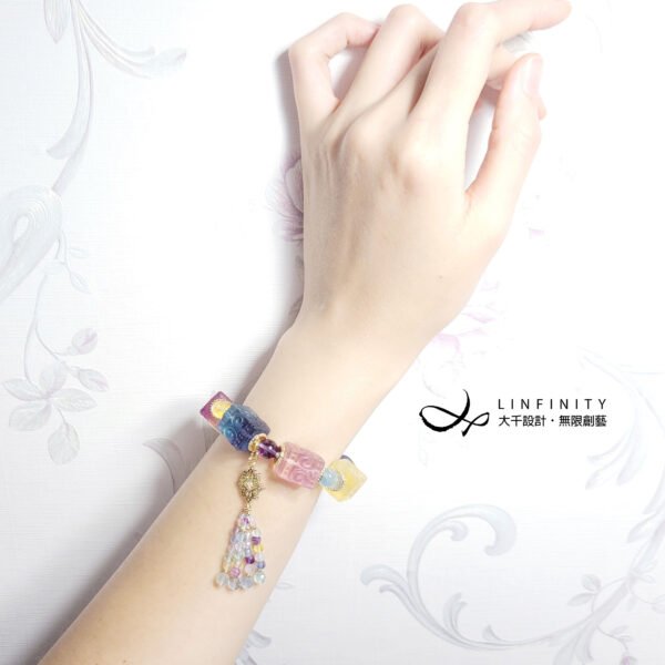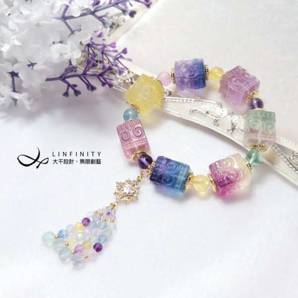 在天然寶石的領域,螢石屬於顏色最豐富的石頭,因為含有鐵、鎂、銅等離子,綠、紫、黃、藍、棕、橙、粉……螢石幾乎可以呈現任何顏色,宛如彩虹般美麗,故亦有「彩虹寶石」之美稱。
