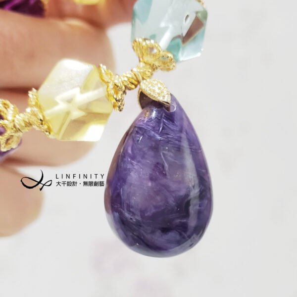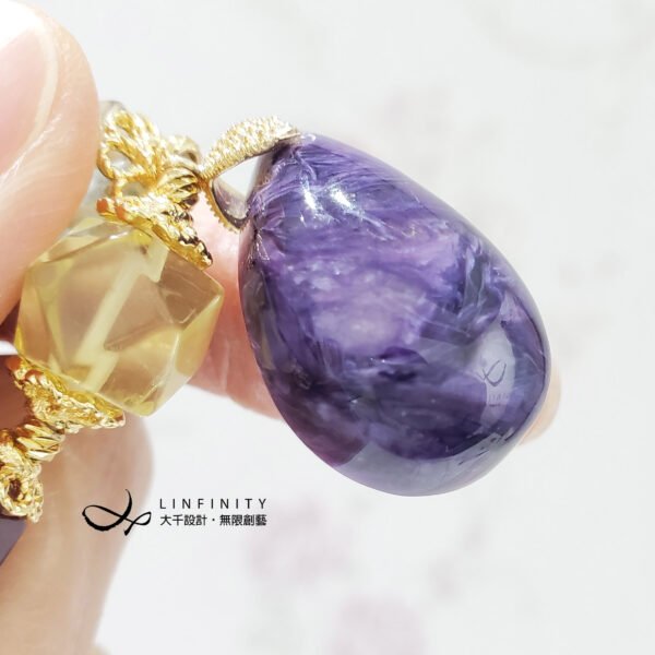 紫龍晶(Charoite)又名查羅石,其紫優雅而純正,其間自然分布白色螺旋條紋狀,獨特而美麗。