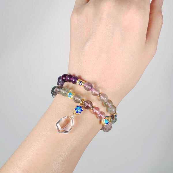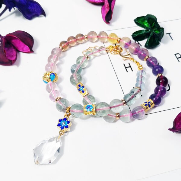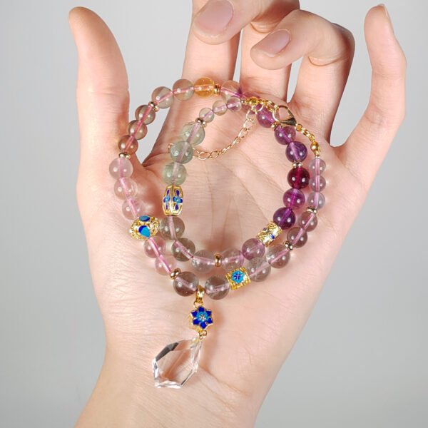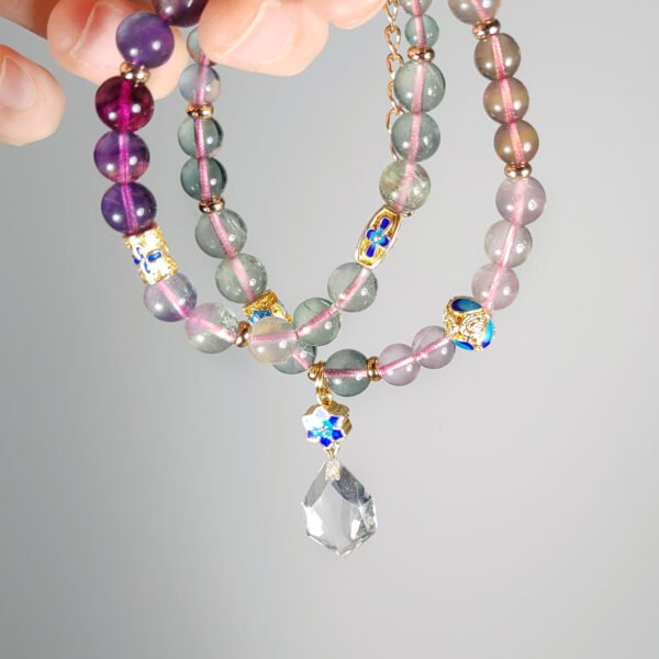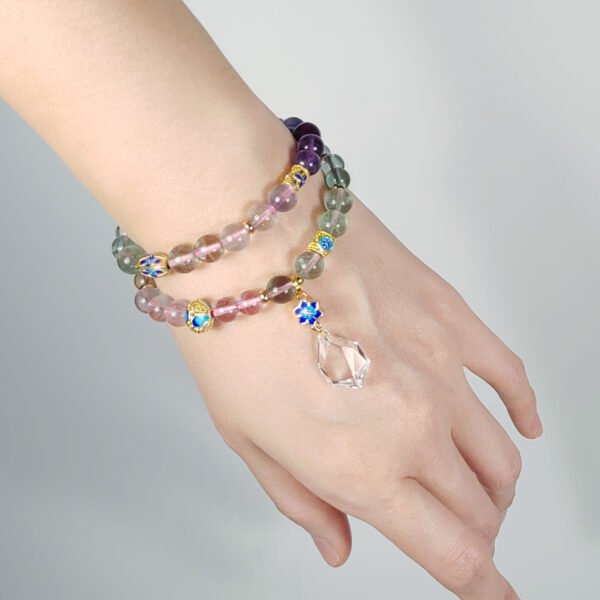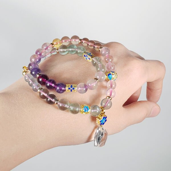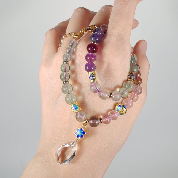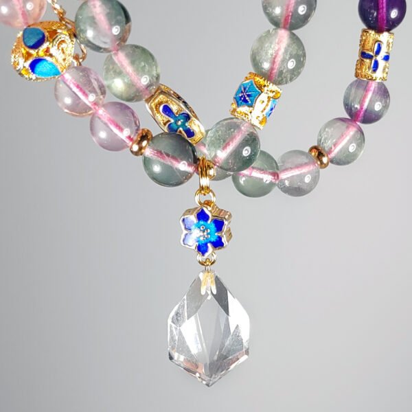 嚴選天然彩虹螢石,水光清透、火彩繽紛,相佐精工琺瑯六字真言,富貴吉祥、氣場非凡。