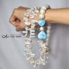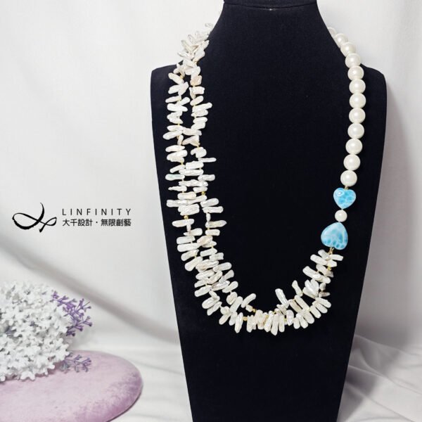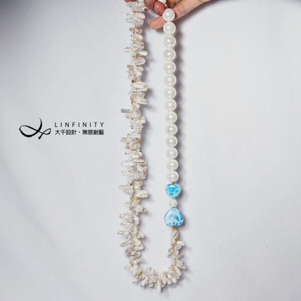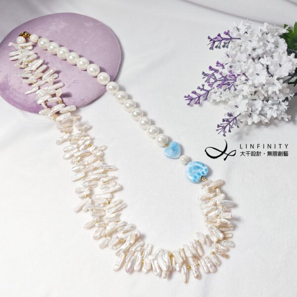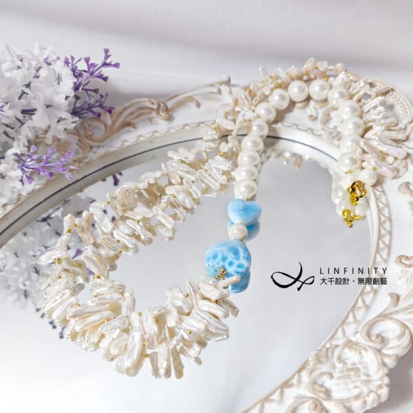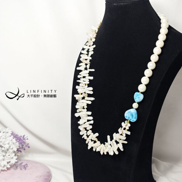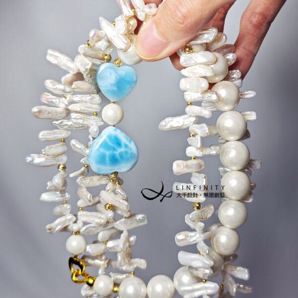 拉利瑪頂級品種,獨有的海水紋理優美,閃現夢幻藍彩,局部玉化顯層次,無黑斑、無礦缺,磨製心形(心想事成),設計為蝴蝶結(節節高升、高風亮節),佐圓貝珠、巴洛克珍珠(天然不規則形珍珠)設計不對稱鍊身,富有韻律感,優雅環繞胸前,每個角度都迷人。