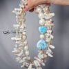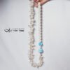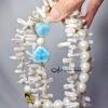 拉利瑪頂級品種,獨有的海水紋理優美,閃現夢幻藍彩,局部玉化顯層次,無黑斑、無礦缺,磨製心形(心想事成),設計為蝴蝶結(節節高升、高風亮節),佐圓珍珠、巴洛克珍珠(天然不規則形珍珠)設計不對稱鍊身,富有韻律感,優雅環繞胸前,每個角度都迷人。