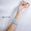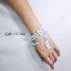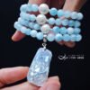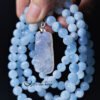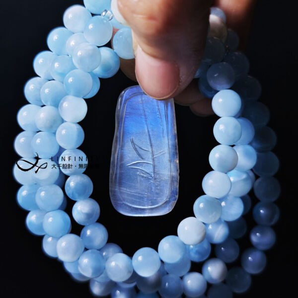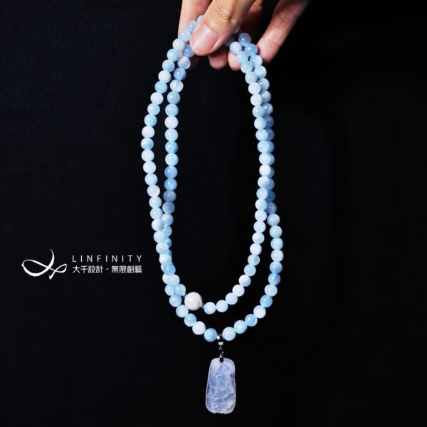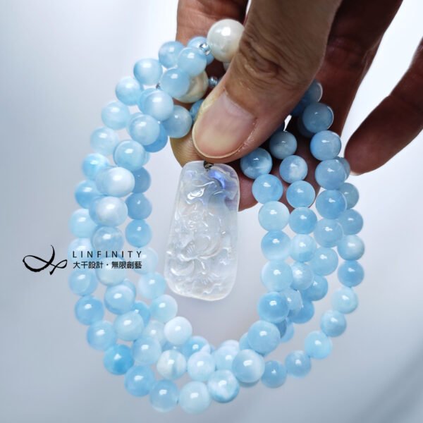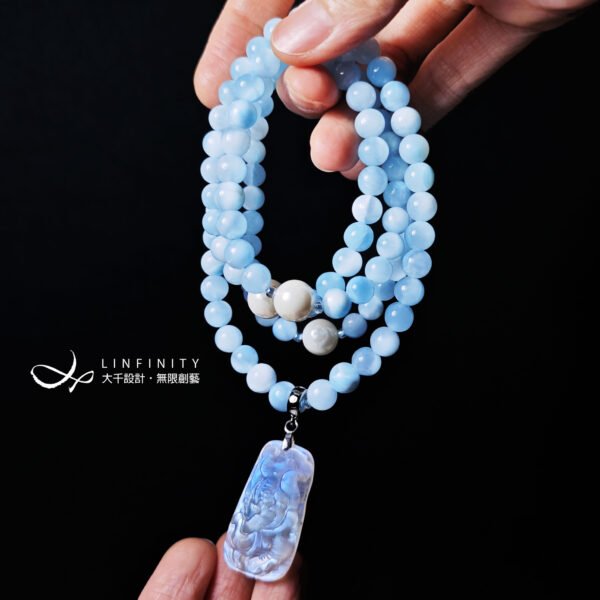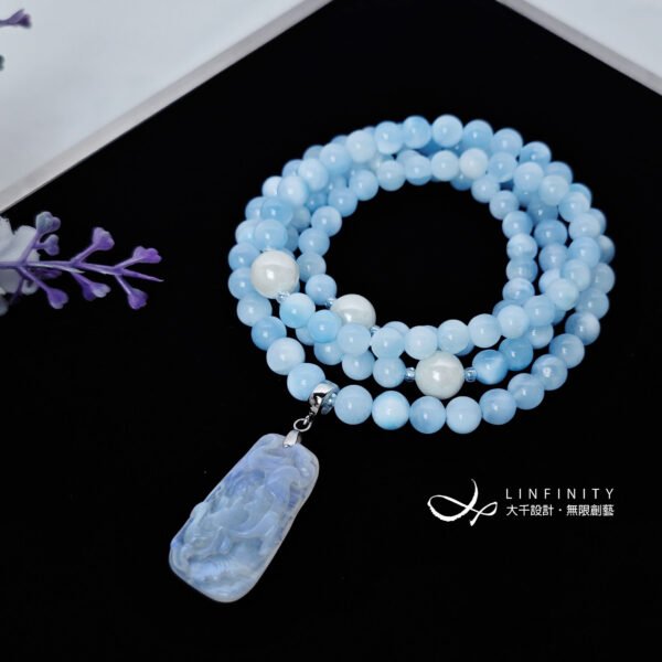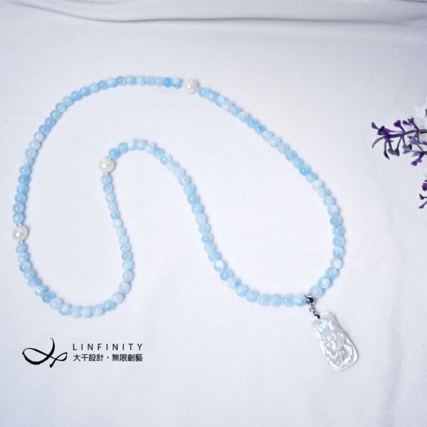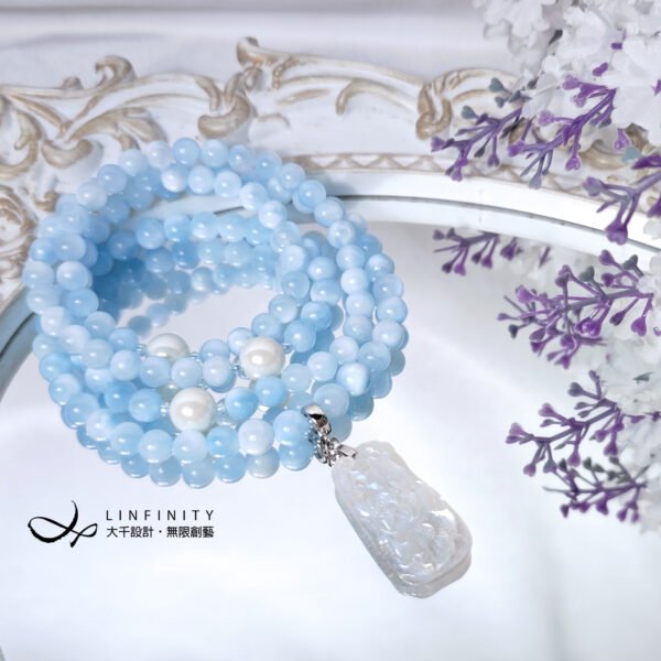 以貝珠點綴鍊身,溫潤、低調、奢華、高貴,整體白、藍色調優雅華美、富貴大器,上手冰涼滑潤,能量澄淨舒適,是充滿靈性、智慧之精品。