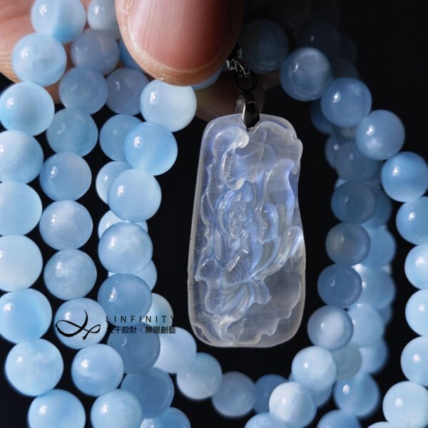 主墜藍月光石溫潤閃耀,雙面閃現高藍光,雕刻蓮花(清淨高潔),寓意吉祥。