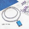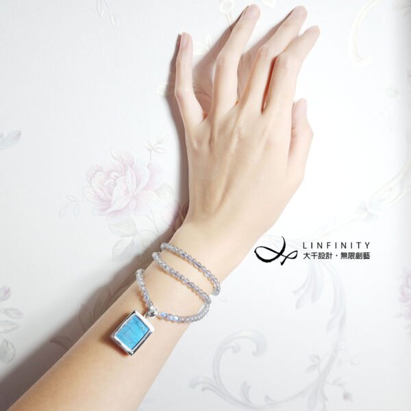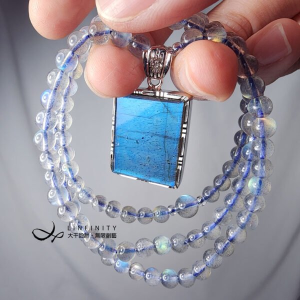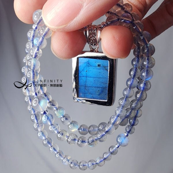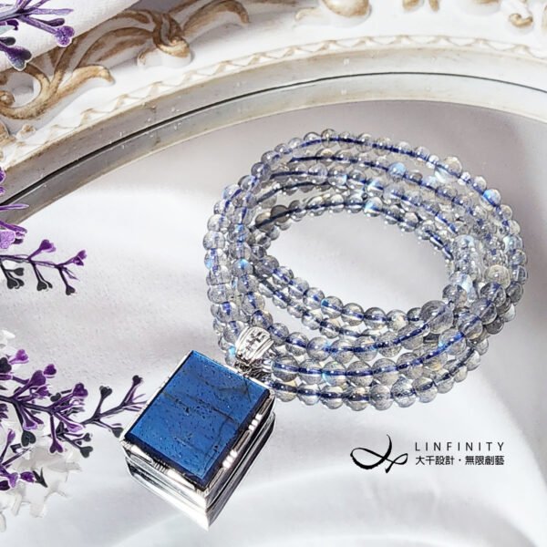 鍊身為透體彩虹灰月光石,閃現迷人夢幻絲綢光,整體藍、彩虹色調優雅華美、富貴大器,上手冰涼滑潤,能量澄淨舒適,是充滿靈性、智慧之精品。