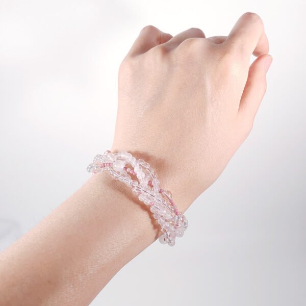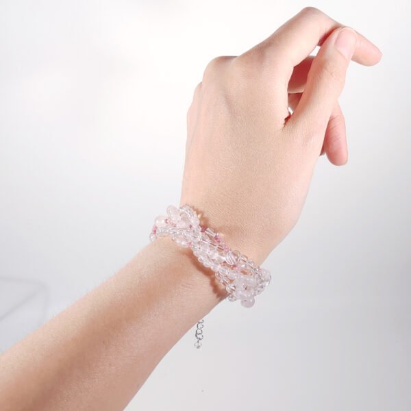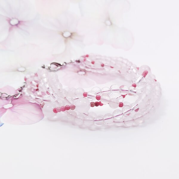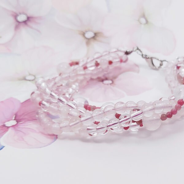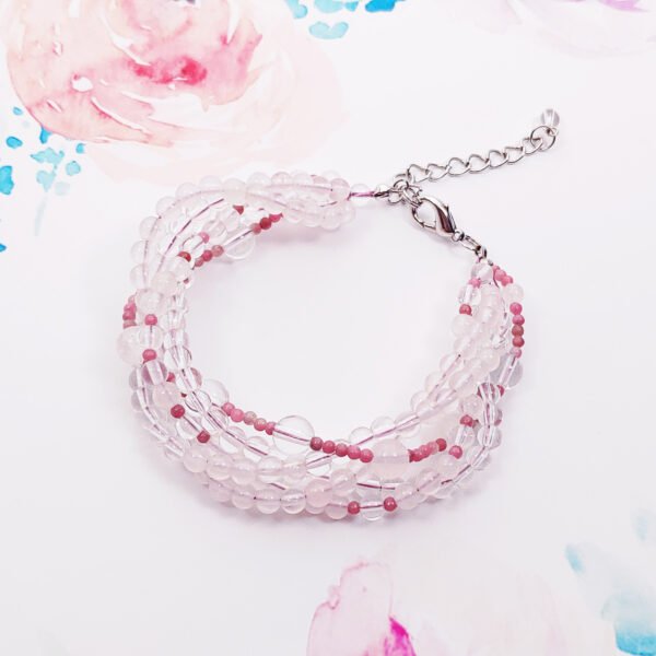 色彩濃豔的花蓮玫瑰石相佐象徵愛情的粉晶與智慧白水晶,交織一場華麗甜美的戀情。