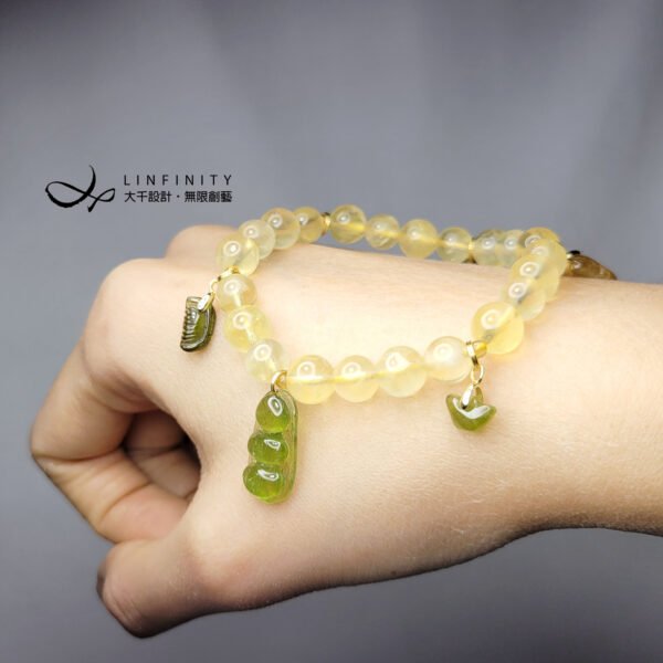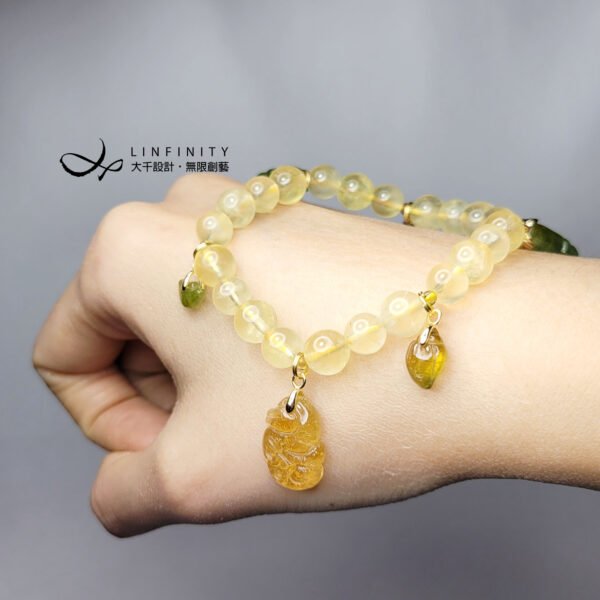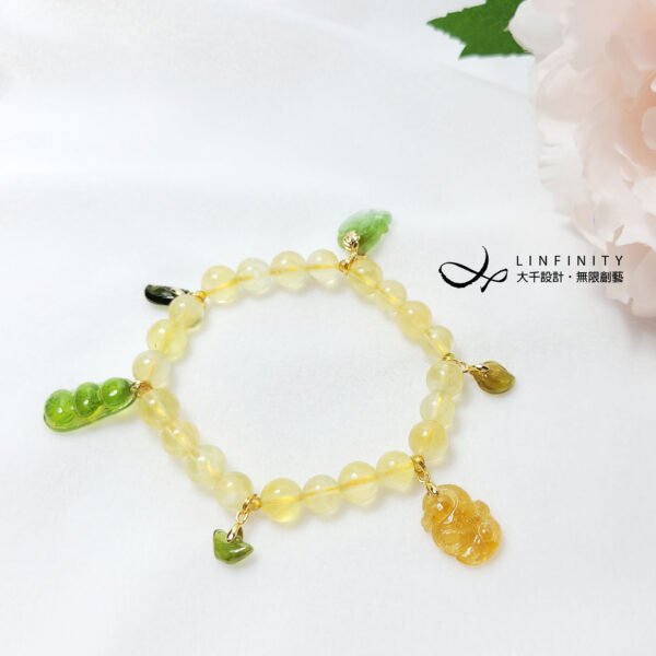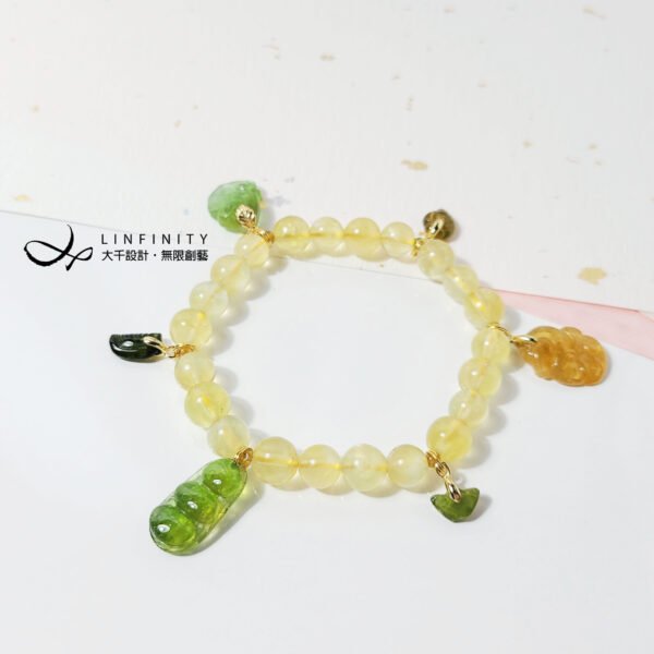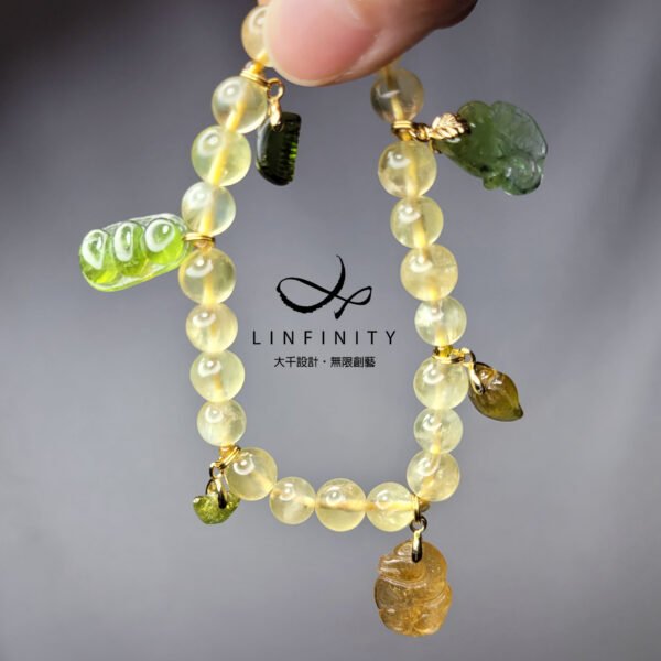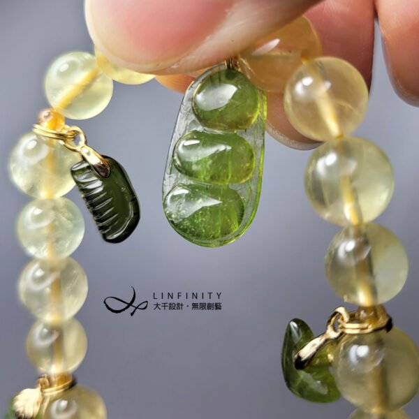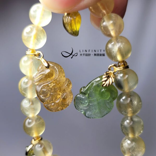 墜飾妝點以金碧璽、金綠碧璽雕刻墜飾,為:金碧璽喜鵲(迎喜)、金綠碧璽豆莢(財富)、果綠碧璽如意(如人所意)、金綠碧璽壽桃(健康)、金綠碧璽元寶(招財)、綠碧璽梳子(順利),件件雕工佳、晶體透、水光美、火彩閃,上手冰涼滑順,時尚美麗,馥含古典氣息,多主墜設計讓配戴更為無礙,每個角度都是一個風景。