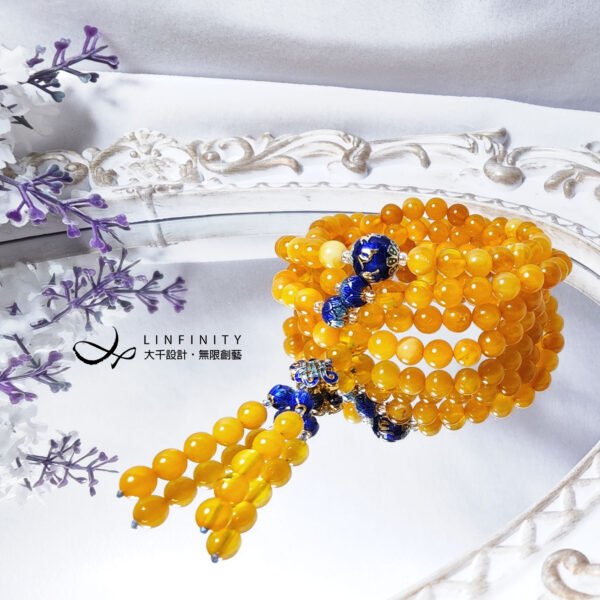 此款嚴選古董級「財石」-琥珀(蜜蠟),佐琺瑯(景泰藍)設計,演繹金光燦燦、堆金積玉之華美貌。