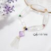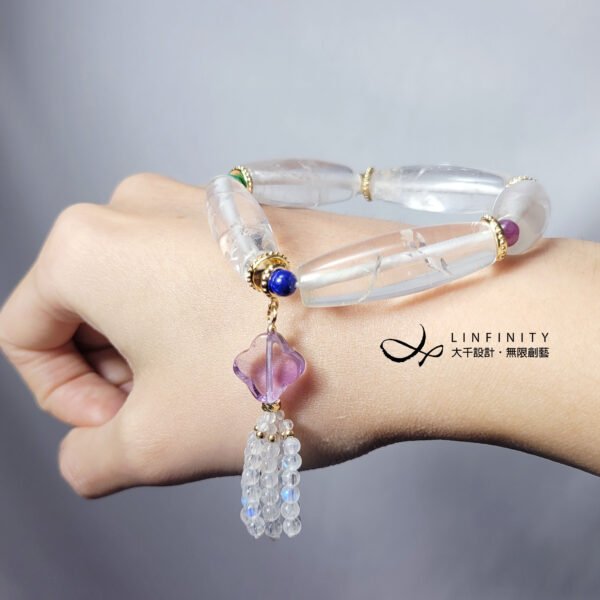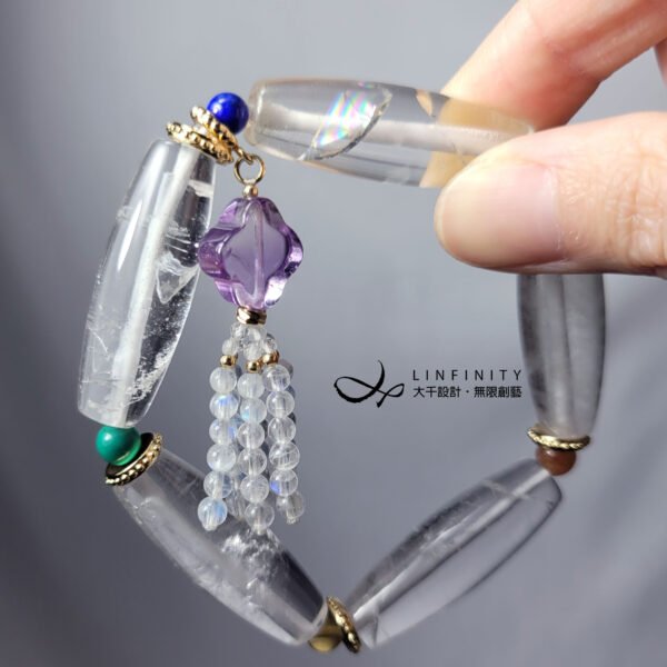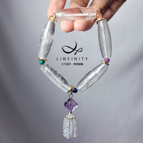 嚴選水晶之王-白水晶中,全美、幽靈等高品種,磨製大體材長柱狀古董珠飾,相佐五行色彩寶石設計。
