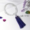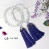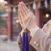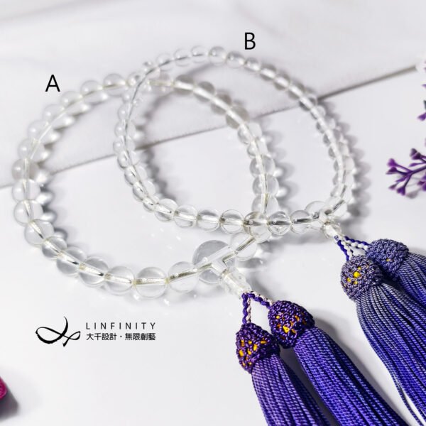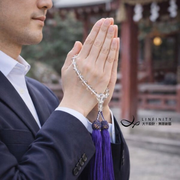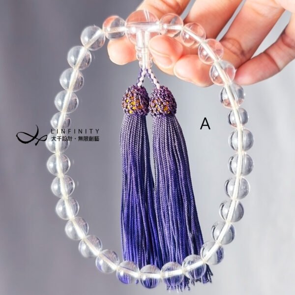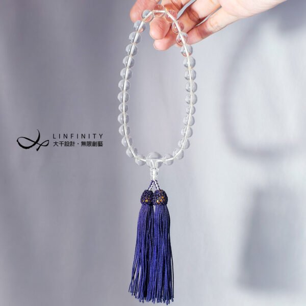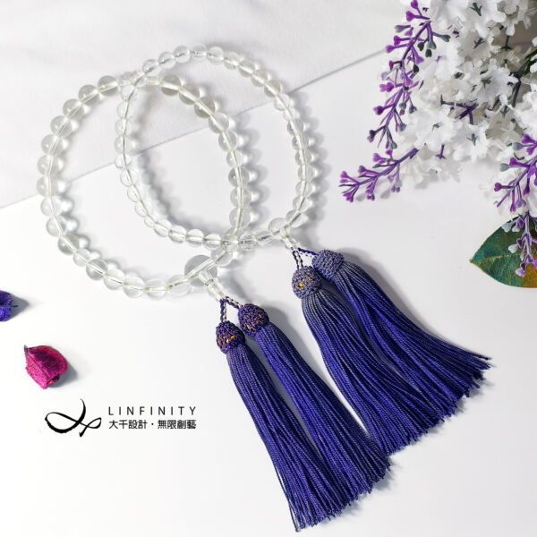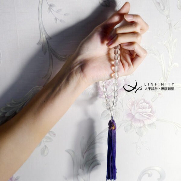 遵循日本傳統日本念珠(數珠 じゅず)端正而莊雅的造型語彙,嚴選天然頂級白水晶(水晶之王,象徵勇氣、力量、智慧、淨化)搭配紫色絹製流蘇,細緻展現台灣工藝美學 × 日本禮儀文化的和諧融合,並承載台日友好的深厚底蘊。