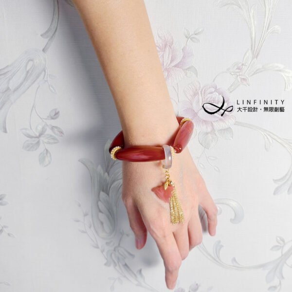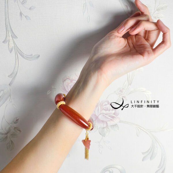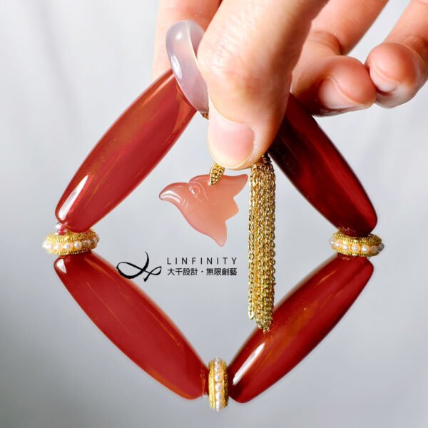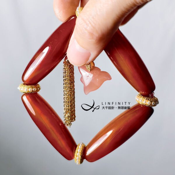 設計師獨家原創,以 4 枚頂級紅瑪瑙長珠為鍊身,寶石體長,晶體冰潤、色彩紅豔,象徵紅運當頭,富貴吉祥。