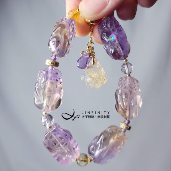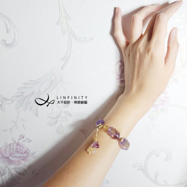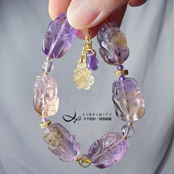 此款嚴選頂級紫黃晶,精工雕製貔貅(招財),寶石晶體淨透、紫黃共生、微帶閃片、彩虹光,飾以頂級黃水晶盤長(吉祥無盡)、紫水晶鑽面水滴(富貴),極顯大器、華麗,是為助事業、開智慧、招財之美物。