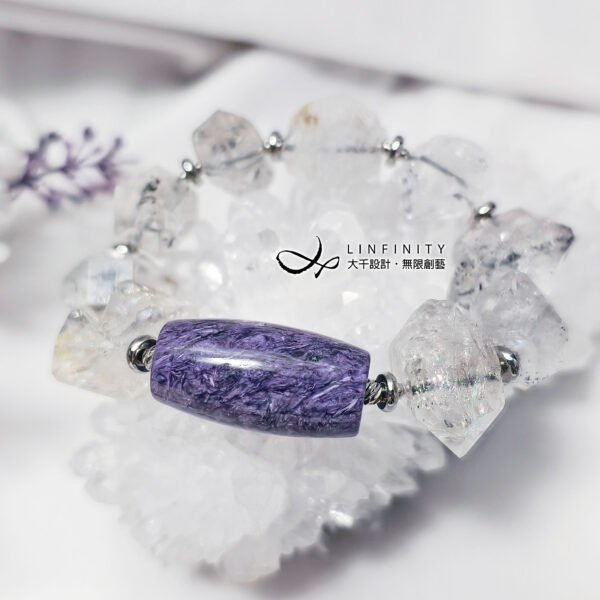 紫龍晶(Charoite)又名查羅石,其紫優雅而純正,其間自然分布白色螺旋條紋狀,獨特而美麗。