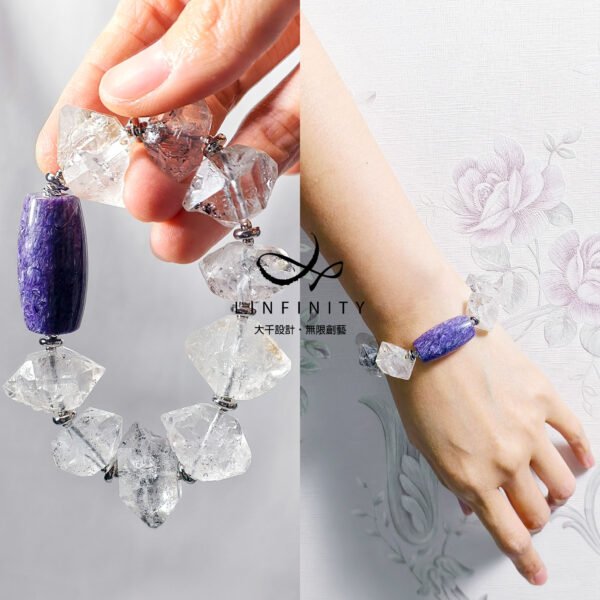 嚴選頂級閃靈鑽,寶石體碩、晶質淨透、晶體雙尖、閃現彩虹光,主飾頂級紫龍晶(查羅石),大器非凡。