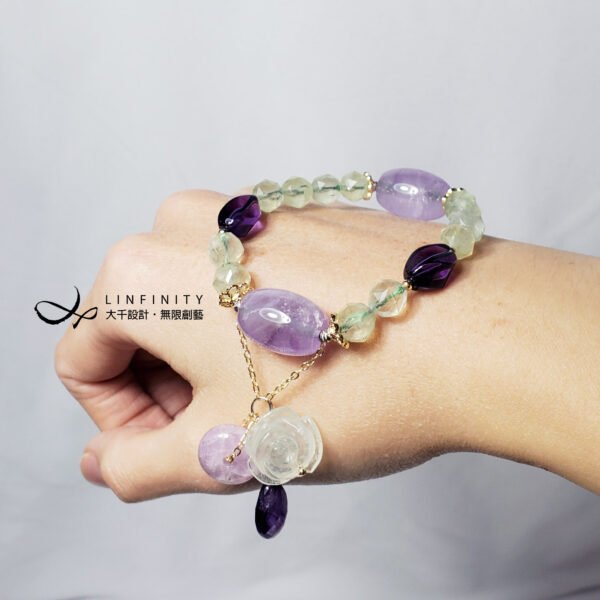 嚴選頂級「希望之石」-葡萄石,精雕玫瑰與切面珠飾,顆顆色澤勻淨、水光極美,整體火彩晶瑩、嬌豔欲滴,予人沈靜、優雅之感。