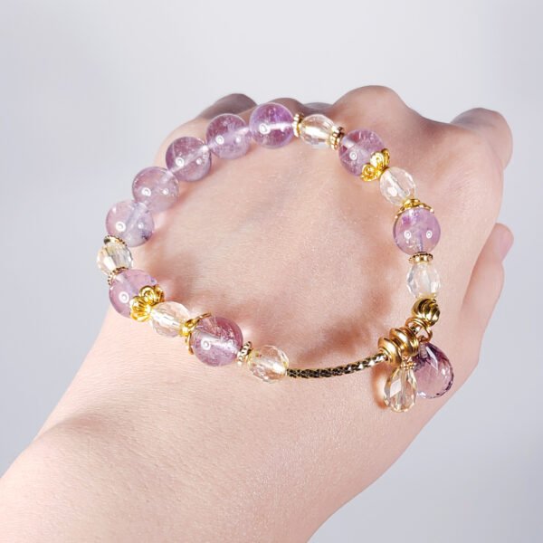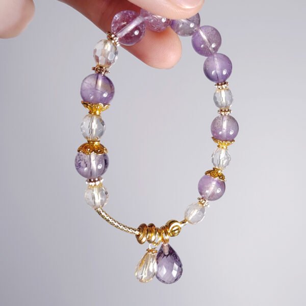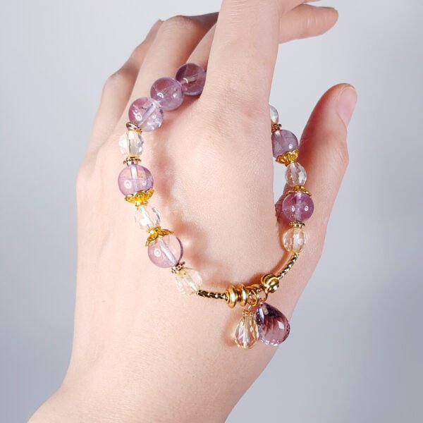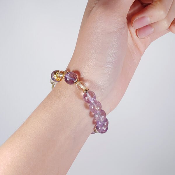 紫黃晶晶體中同時帶有紫色與黃色兩種顏色,為自然界中紫水晶、黃水晶互相變化的過程偶然產生,以自然產生者佳。
